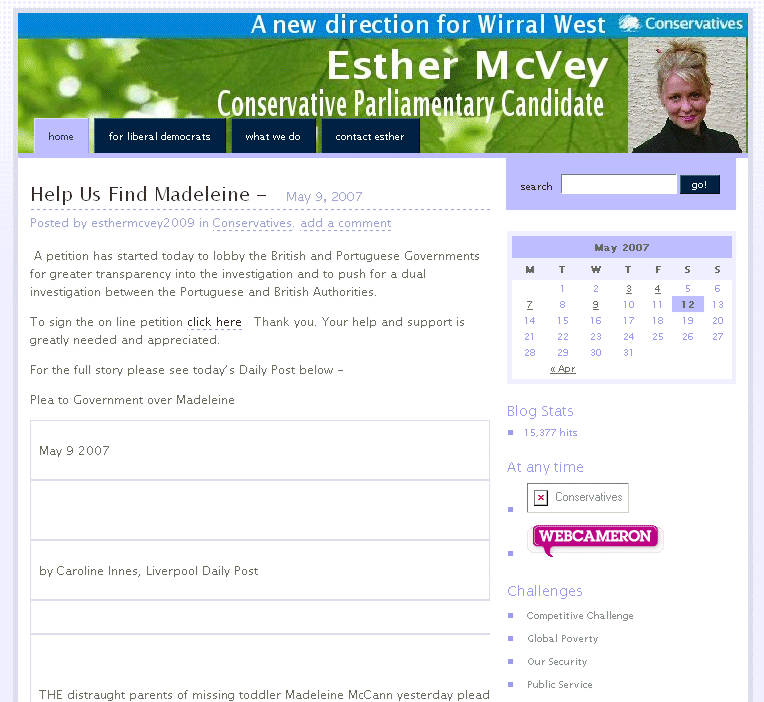 blog from 09 May 2007. The petition has since been removed leaving no reference to Madeleine McCann anywhere on Esther McVey's