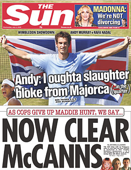 their front cover: "The police quit searching for Maddie and we say… now clear the McCanns". The 'Daily Mirror' placed