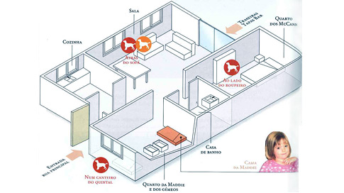 Regarding the diagram, produced by Correio da Manhã, there are a few mistakes: for example, the sofa should be placed under the left window, there, exactly at the middle of the window, human blood and cadaver scent was found. The window in the twins and Maddie's bedroom, which is annotated in the diagram with a dog is wrong - the cadaver scent was found on the opposite side of the apartment, outside, in the small garden or backyard . Through investigation it was established that no one had died in the apartment prior to that day, so the scent and blood, which indicated a partial match to the genetic profile of Madeleine, provides the conviction that she was the one that died there. The closet in the McCanns bedroom was big enough to hide a corpse inside.