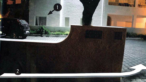 1. Maddie's bedroom window, 2. Route taken to enter apartments by front door