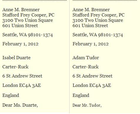 later changed (02 February 2012) to Adam Tudor, a Partner at Carter-Ruck.