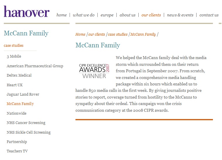McCanns to sympathy about their ordeal. This campaign won the crisis communication category at the 2008 CIPR awards.