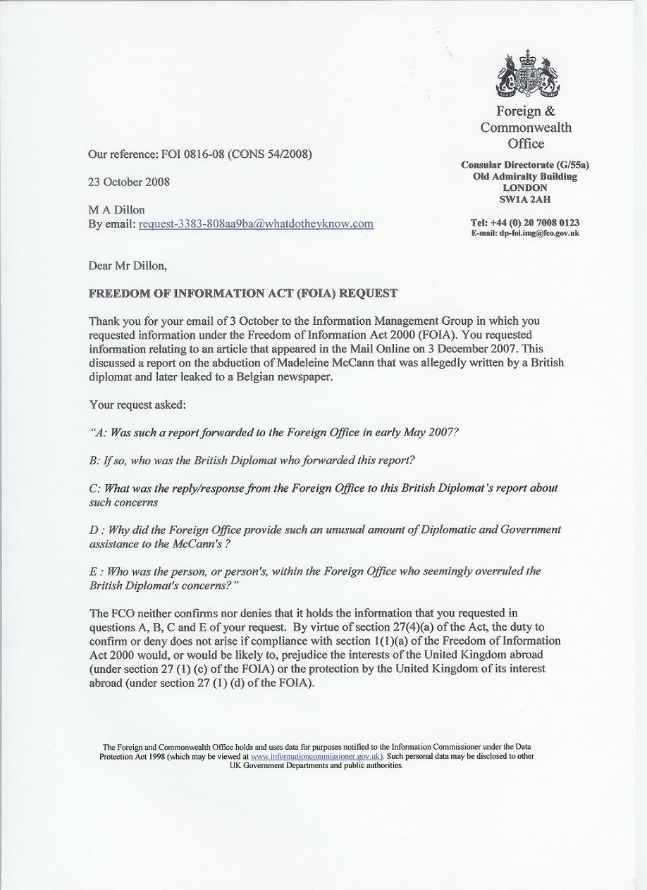 British Diplomat warned Foreign Office of concerns over McCanns, 03 October 2008