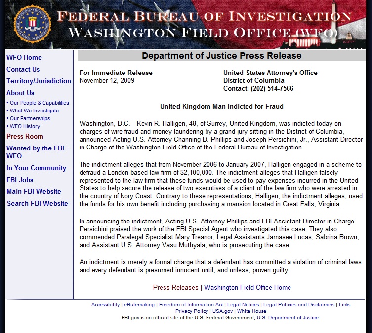 Cumberland, acting for the US Government, said Halligen was wanted in connection with a "wire fraud and money laundering". The US Department of Justice issued an indictment for Halligen, from Surrey, last month, alleging he tried to defraud