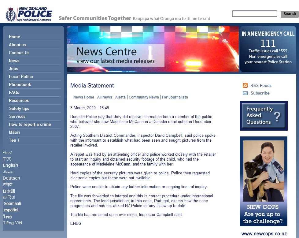 NZ police defend inaction on McCann sighting, 03 March 2010