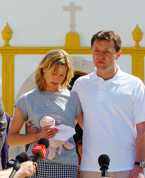 Kate and Gerry McCann talk to the waiting media outside the church in Praia da Luz