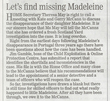 disappearance of their daughter Madeleine. It is our sincere hope that Ms May will tell the McCanns that she has ordered a
