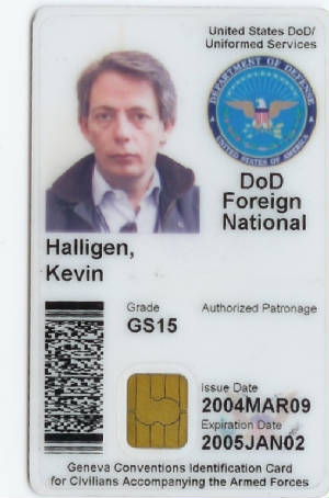 with Halligen's name and photo, issued by the U.S. Department of Defense. These smart cards, with embedded computer chips,