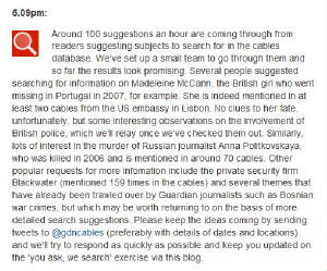 'Several people suggested searching for information on Madeleine McCann, the British girl who went missing in Portugal in 2007, for example. She is indeed mentioned in at least two cables from the US embassy in Lisbon. No clues to her fate, unfortunately, but some interesting observations on the involvement of British police, which we'll relay once we've checked them out.'