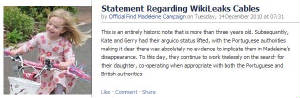 "The WikiLeaks 'news' this week has led to the repetition of many unfounded allegations and smears both in the UK and Portugal in particular. This has been seized on as an opportunity by those who wish to compound our suffering and hamper our efforts, including the very person entrusted with finding our daughter."