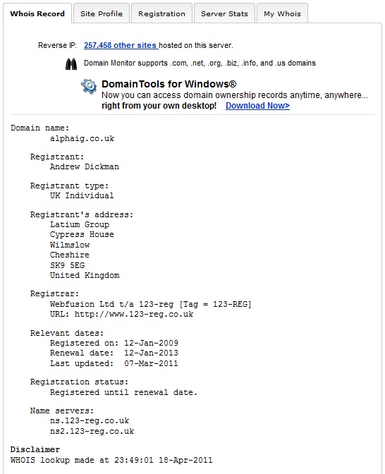 Domain name 'alphaig.co.uk' registered by Brian Kennedy's Latium Group Whois.domaintools.com