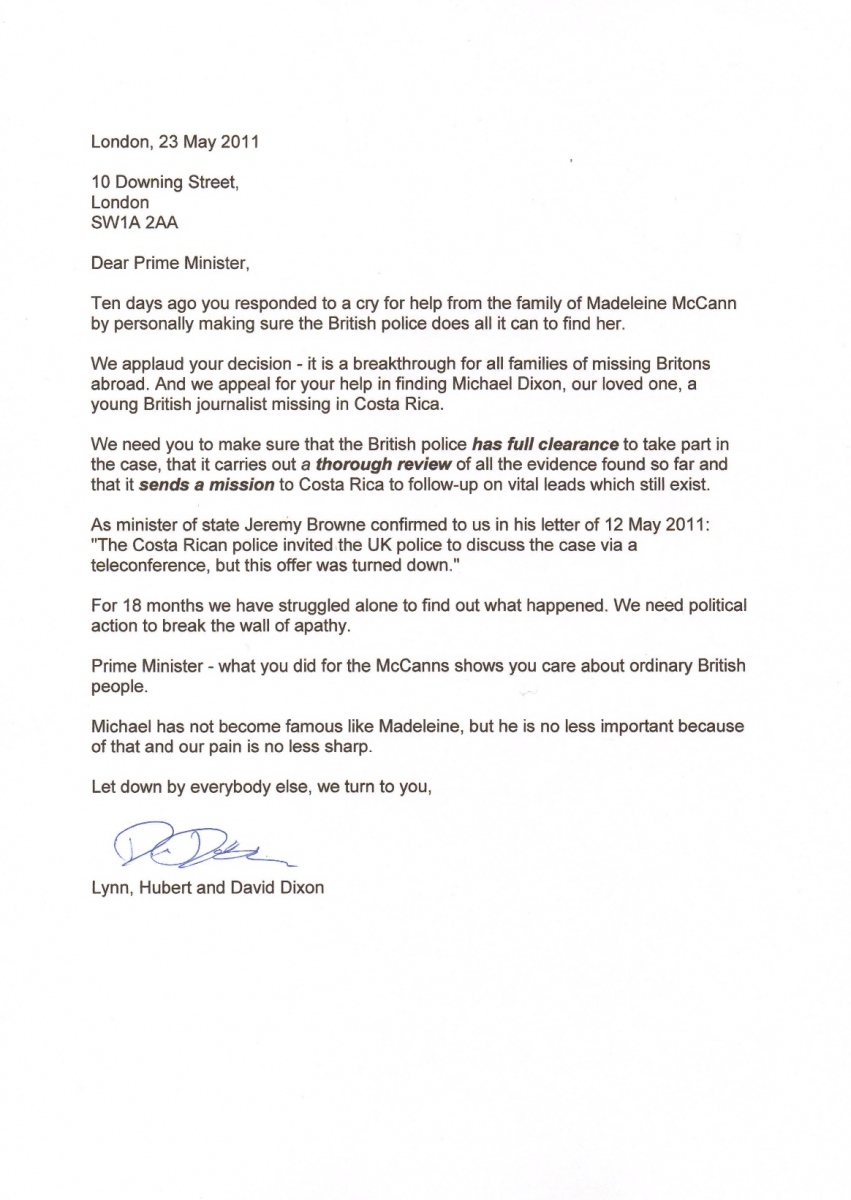 The family of missing British journalist Michael Dixon has written to Prime Minister David Cameron to appeal for help,