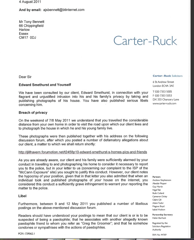 any formal admission of liability. Mr Smethurst has said via Carter-Ruck that he will pay this sum into the Find Madeleine