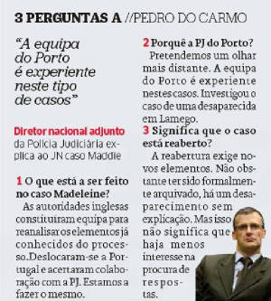 This is picked up just over a week later by Jornal de Notícias, who declare that the case is going to be reopened. However, this is swiftly denied by the National Deputy Director of the PJ, Pedro do Carmo, who guarantees that there is no new evidence regarding the disappearance of Madeleine McCann to prompt the reopening of the case. However, he does reveal that the PJ team of investigators from Oporto was established one year previously and has been working in collaboration with the British police.