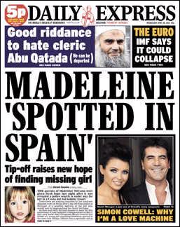 Madeleine 'spotted in Spain' Sunday Express (paper edition)