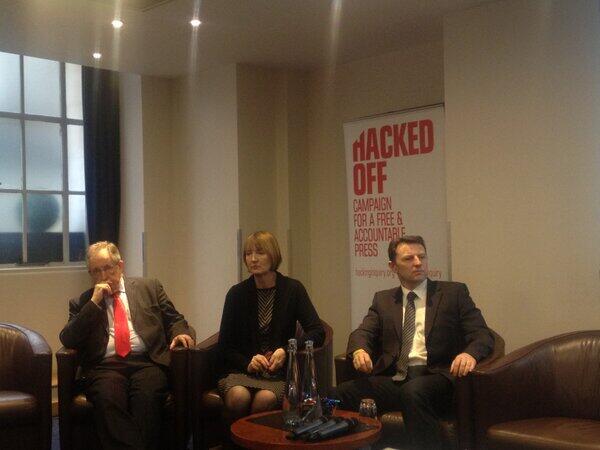 Lord McNally, Harriet Harman and Gerry McCann about to talk at Hacked Off conference, 11 Feb 2013