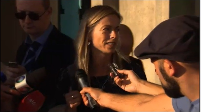 Kate McCann delivers a brief statement to the press outside the Palace of Justice but does not accept any