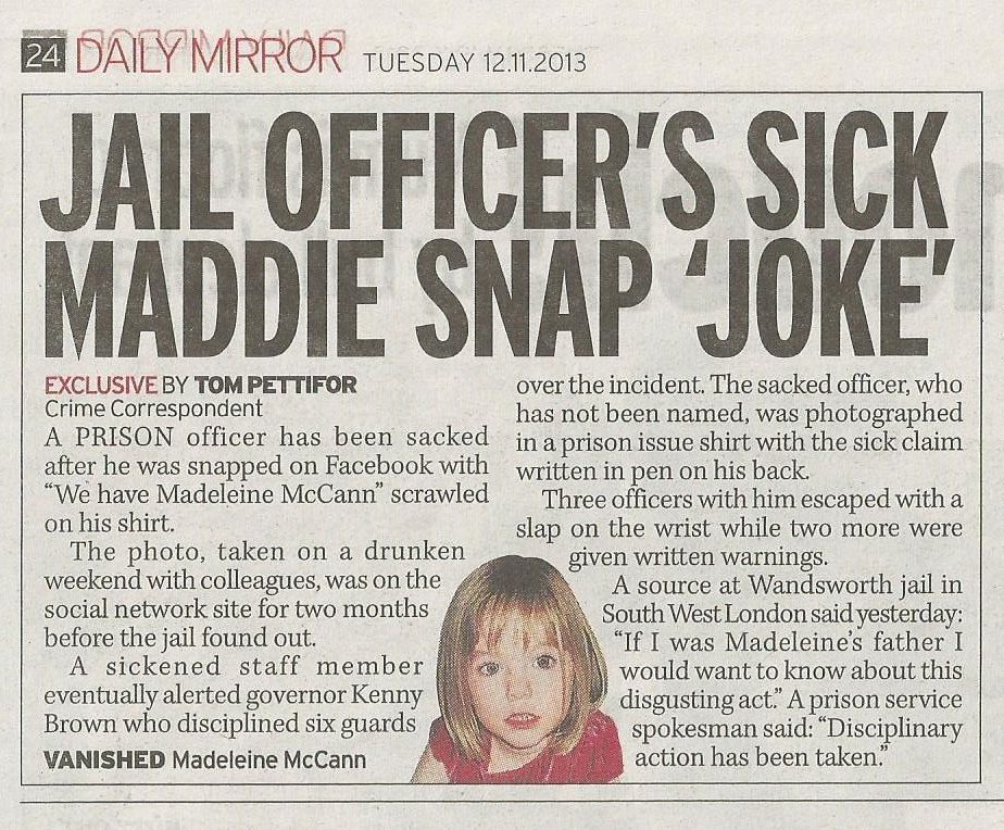 others warned for sick Madeleine McCann joke on drunken weekend, 12 November 2013