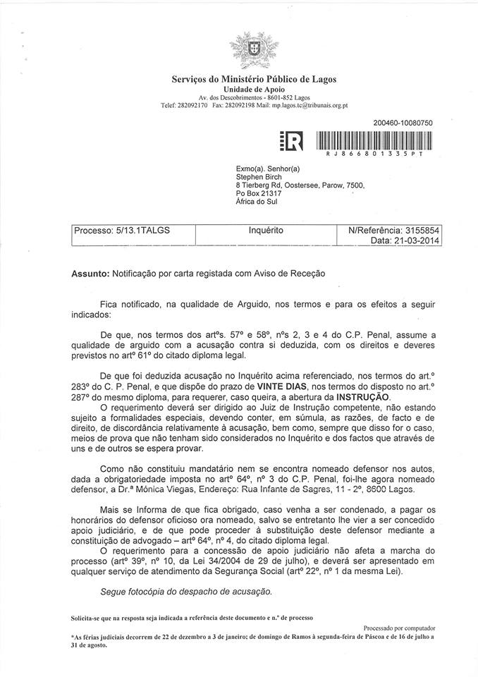 Stephen through the Ministerio da Justica of Portugal....The action was launched on the 21 March 2014