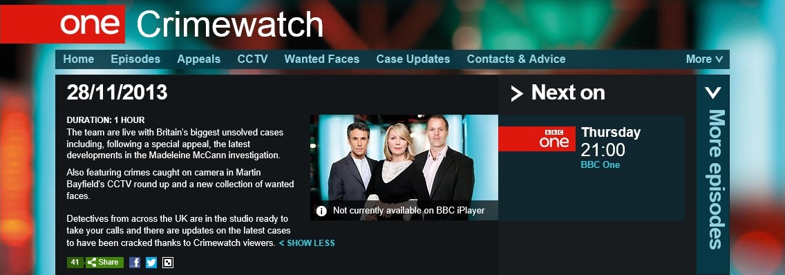 2013: The Crimewatch update is broadcast, although this amounts to little more than a brief comment from the McCanns
