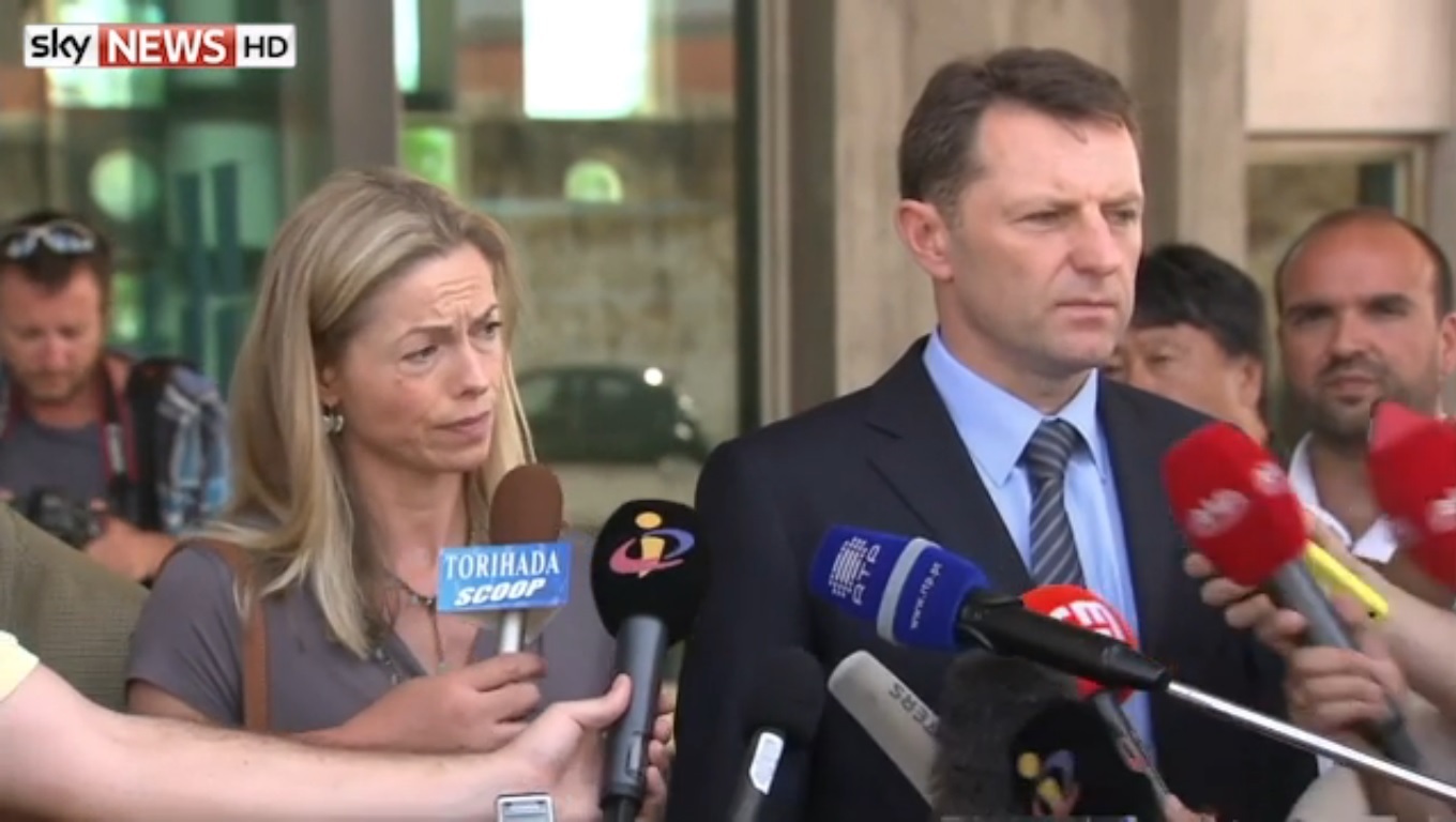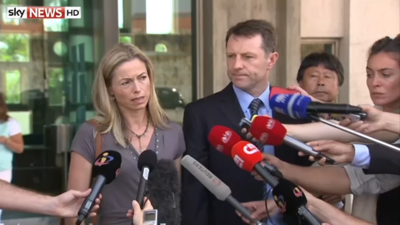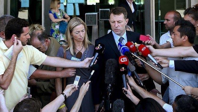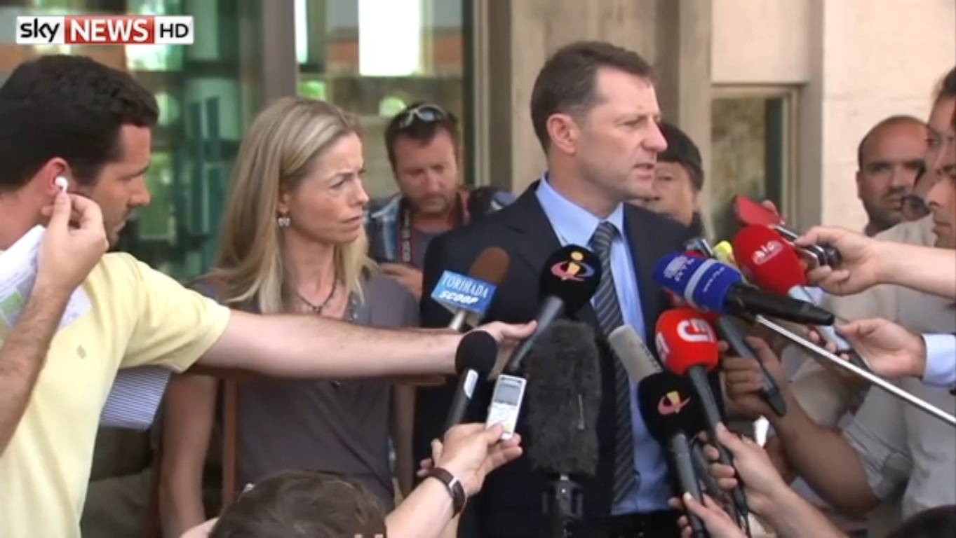 Gerry McCann (right), parents of missing British youngster Madeleine McCann, talk to the press after delivering statements