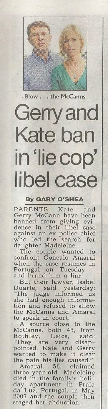 banned from giving evidence at resumption of ex-cop Goncalo Amaral's libel trial next week