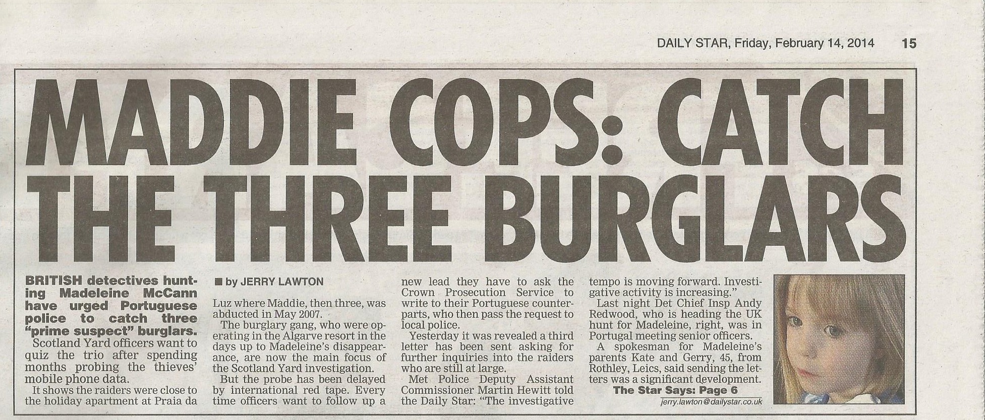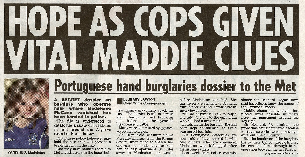 Hope for Madeleine McCann case as cops are given vital clues Daily StarA SECRET dossier on burglars who operate near where Madeleine McCann vanished has been handed to police. By Jerry Lawton / Published 24th February 2014
