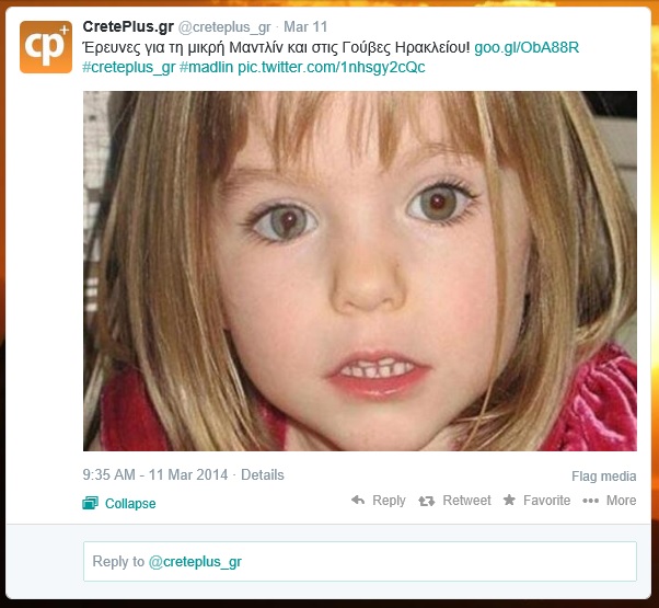 11 March 2014 Patris, a daily Greek newspaper which principally serves the island of Crete, claims a sighting of Madeleine in Gouves.