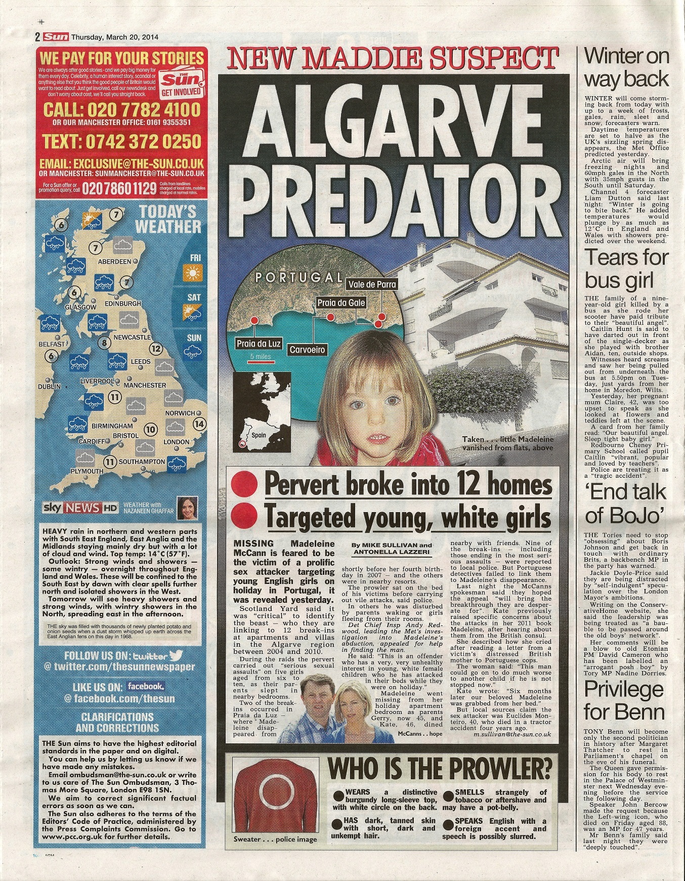 22 March 2014 The Sunday Mirror claims police are hunting two Eastern European bogus charity workers who targeted Algarve holiday