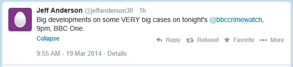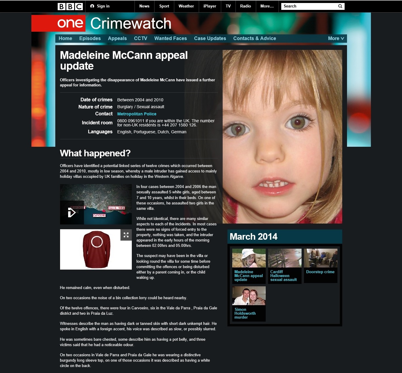 19 March 2014 The Met appeal for information, through their own website and a BBC Crimewatch appeal, in respect of a man seen wearing