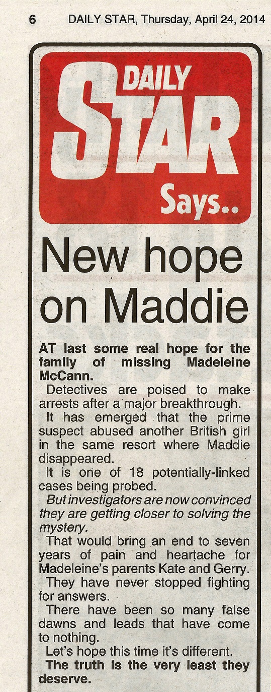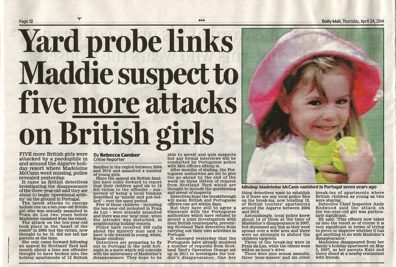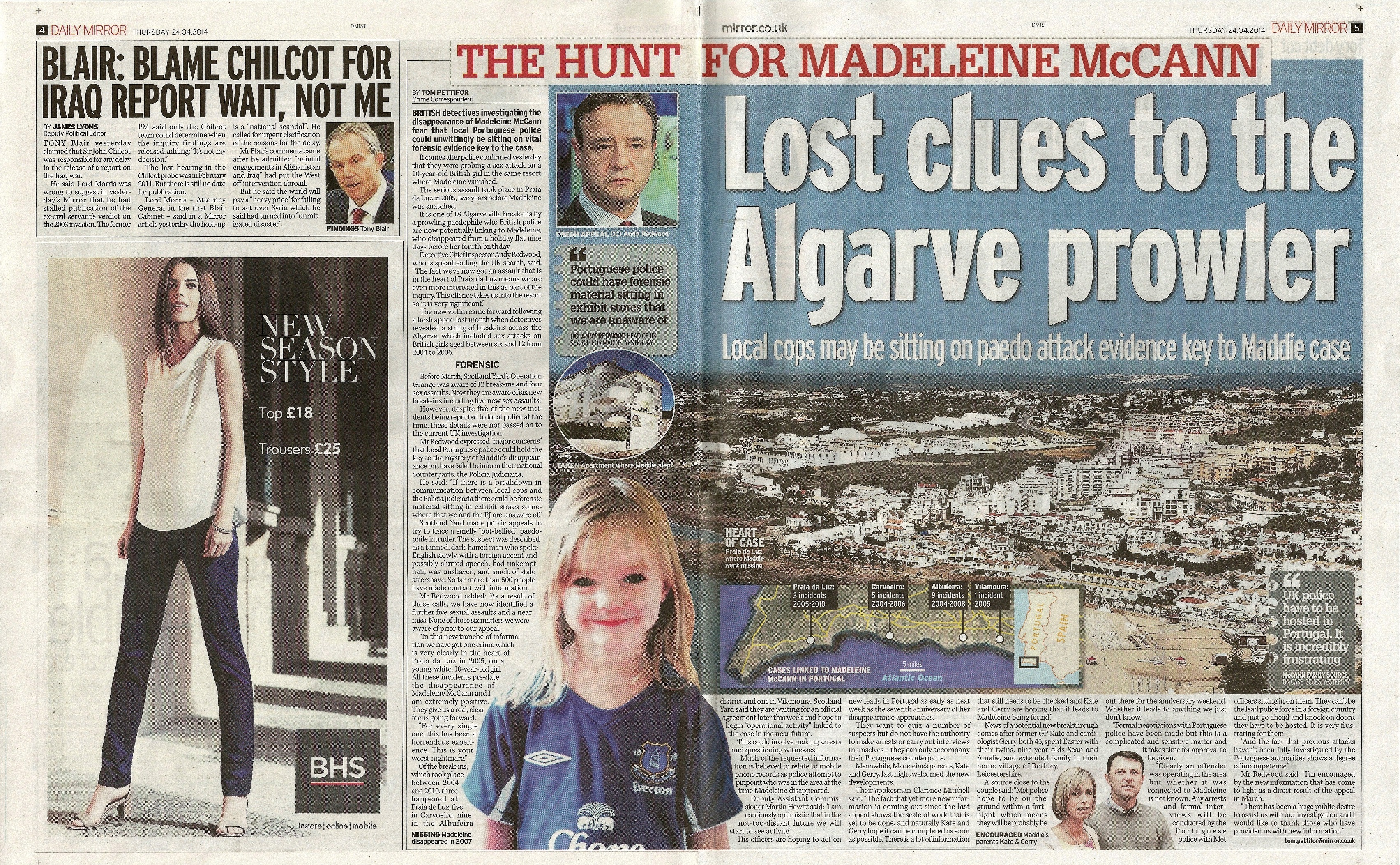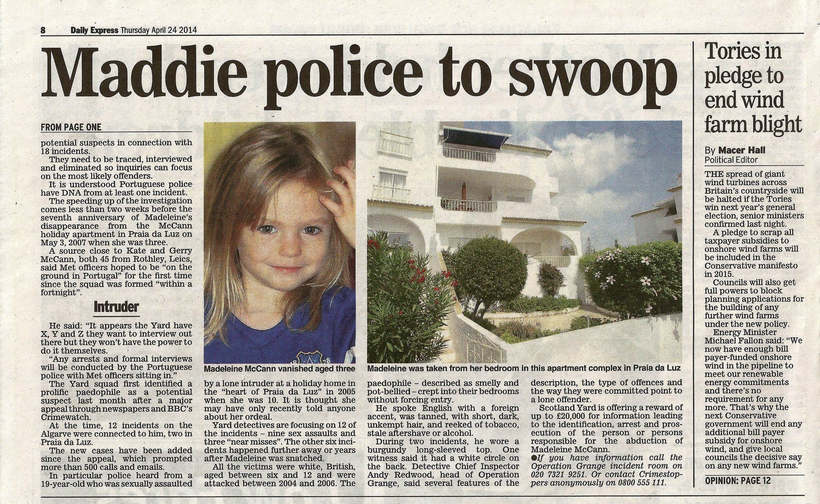 19 April 2014 The Daily Mirror claim police want to question five British holiday flat owners over who was in their