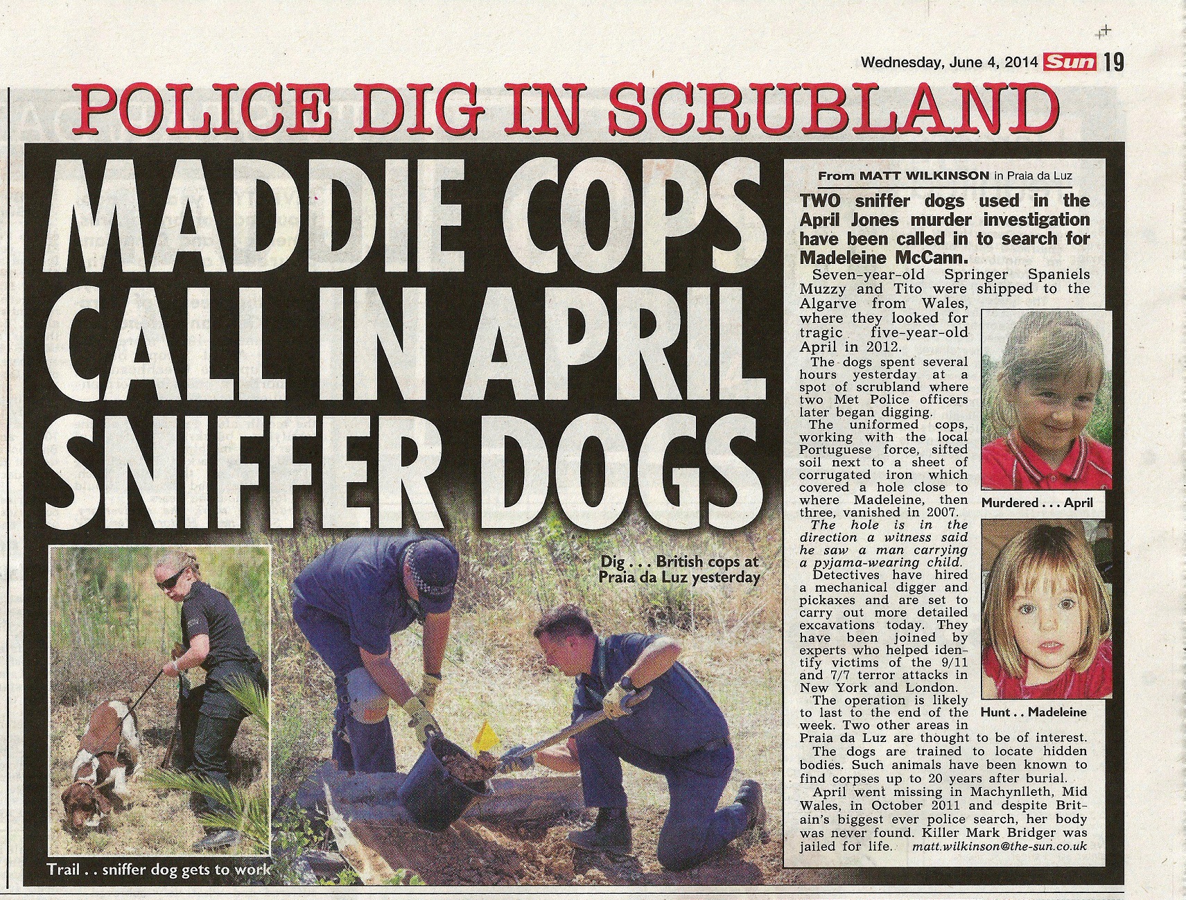 used to search for murdered five-year-old April Jones yesterday joined the hunt for Madeleine McCann in the Algarve.Two "CSI" sniffer spaniels scoured land close to where she vanished in 2007. Police also started to dig