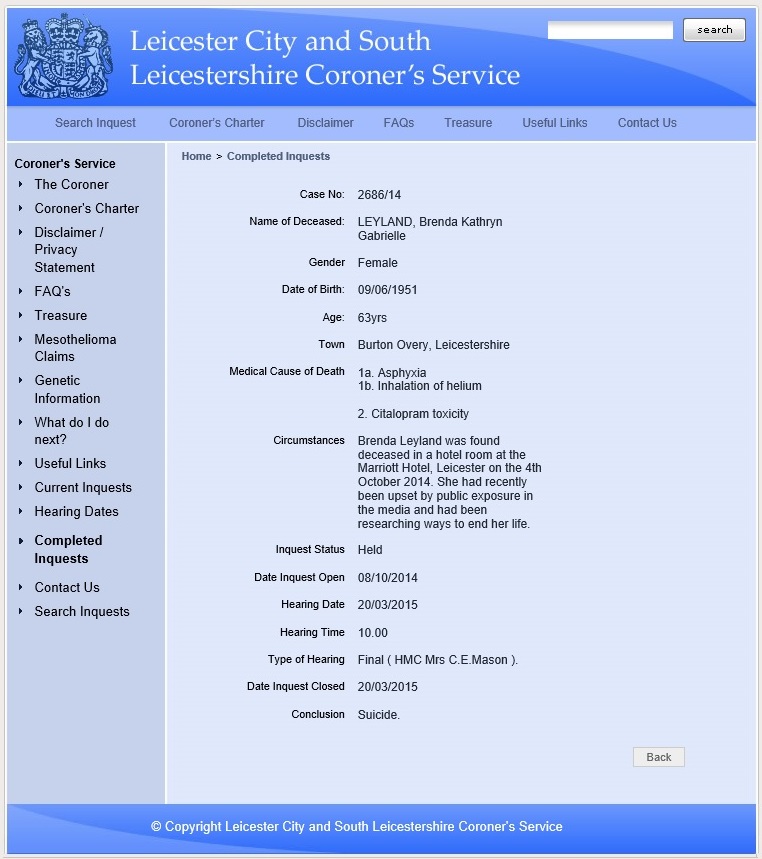 and her details published in national newspapers, Ms Leyland is found dead in a Leicestershire hotel. A post-mortem inquest