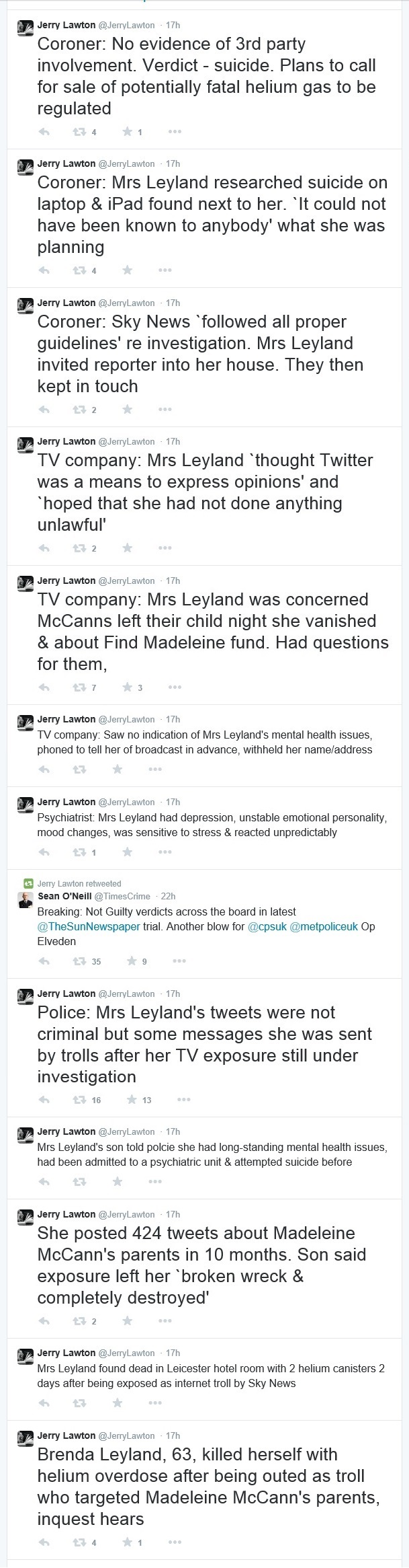 Tweets, Facebook posts and messages from online forums aimed at Kate and Gerry McCann. Ms Leyland was a regular contributor