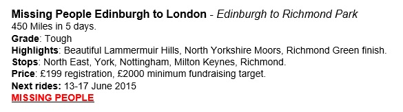a 500 mile cycle challenge for Missing People, starting at the National Galleries of Scotland in Edinburgh, on June 13, before