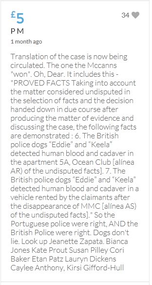 Translation of the case is now being circulated. The one the Mccanns "won". Oh, Dear. It includes this - "PROVED FACTS Taking into account the matter considered undisputed in the selection of facts and the decision handed down in due course after producing the matter of evidence and discussing the case, the following facts are demonstrated : 6. The British police dogs “Eddie” and “Keela” detected human blood and cadaver in the apartment 5A, Ocean Club [alínea AR) of the undisputed facts]. 7. The British police dogs “Eddie” and “Keela” detected human blood and cadaver in a vehicle rented by the claimants after the disappearance of MMC [alínea AS) of the undisputed facts]." So the Portuguese police were right, AND the British Police were right. Dogs don't lie. Look up Jeanette Zapata. Bianca Jones Kate Prout Susan Pilley Cori Baker Etan Patz Lauryn Dickens Caylee Anthony, Kirsi Gifford-Hull