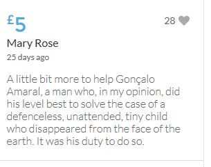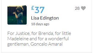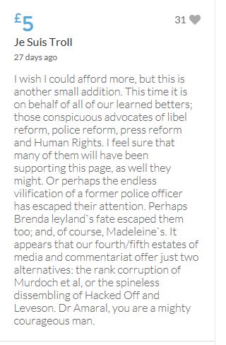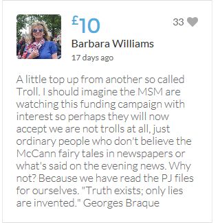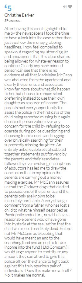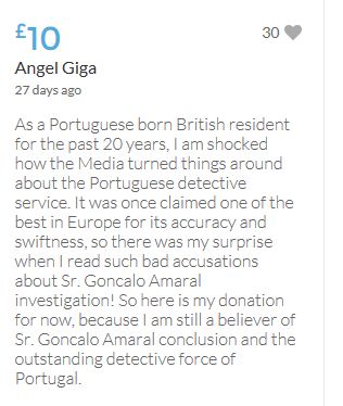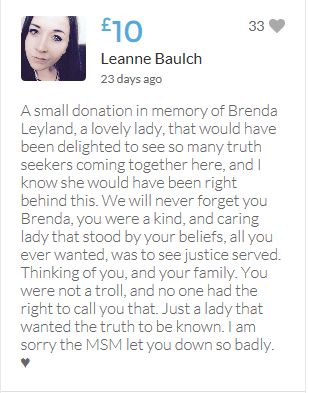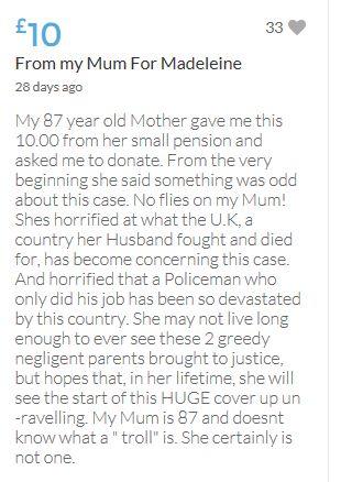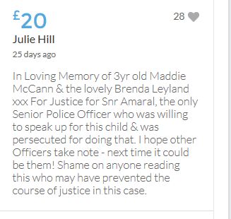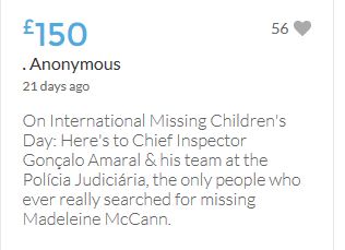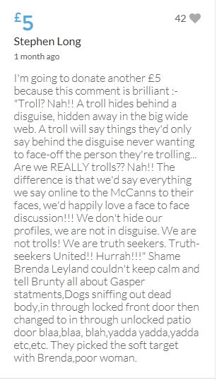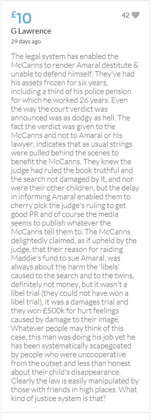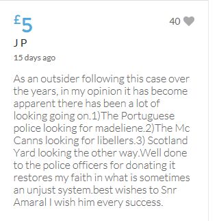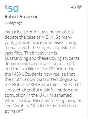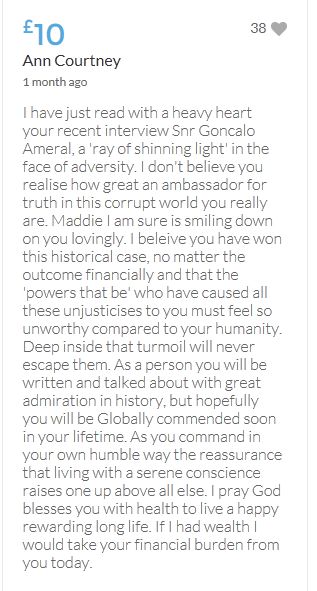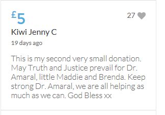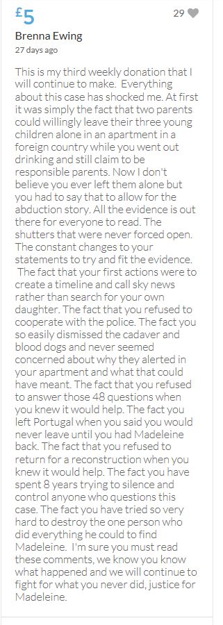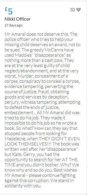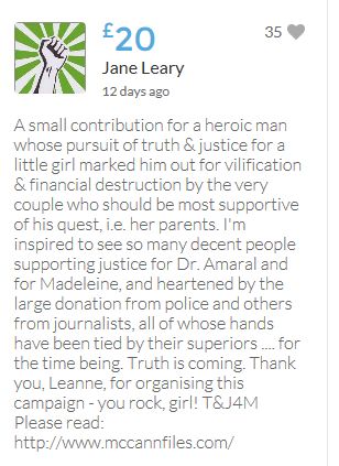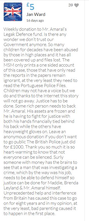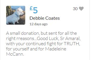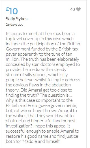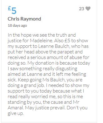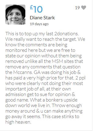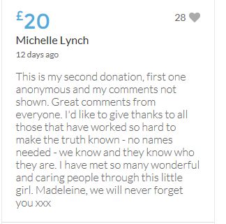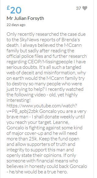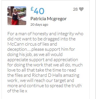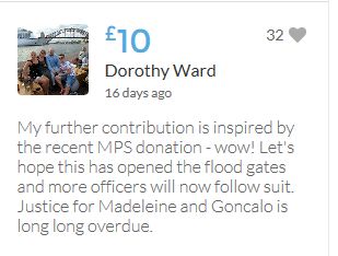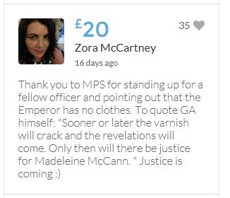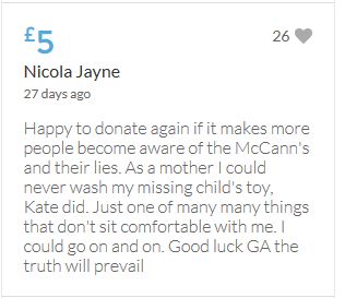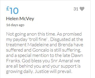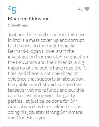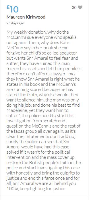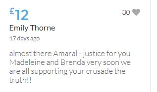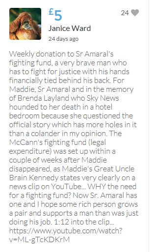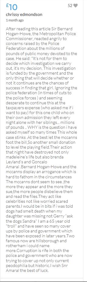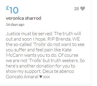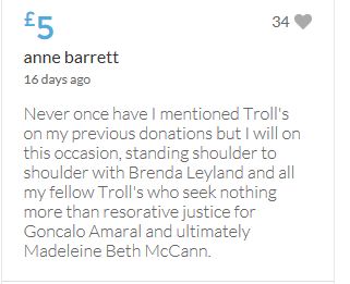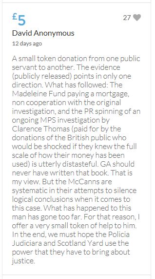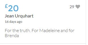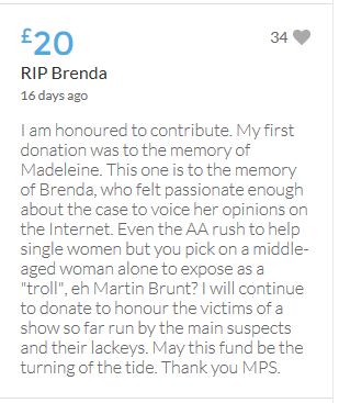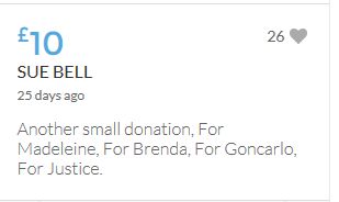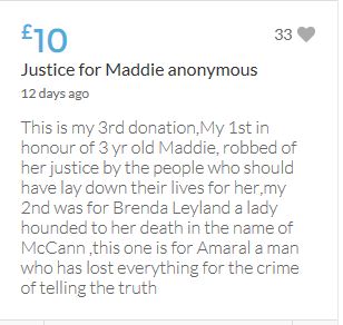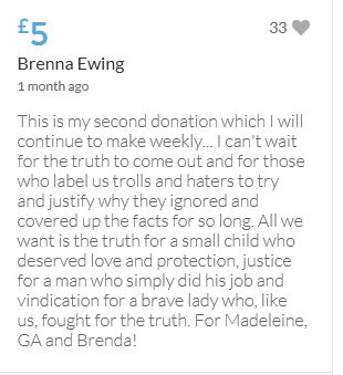 This is my second donation which I will continue to make weekly... I can't wait for the truth to come out and for those who label us trolls and haters to try and justify why they ignored and covered up the facts for so long. All we want is the truth for a small child who deserved love and protection, justice for a man who simply did his job and vindication for a brave lady who, like us, fought for the truth. For Madeleine, GA and Brenda!