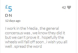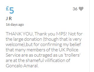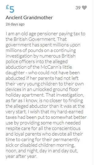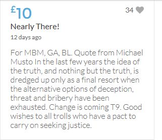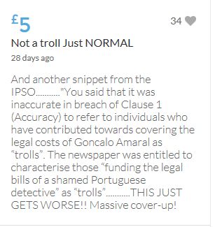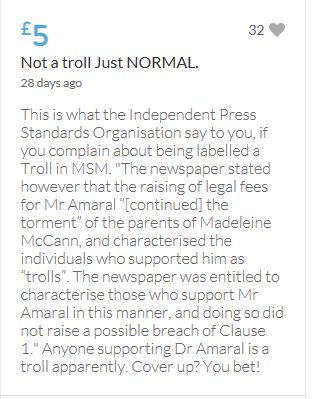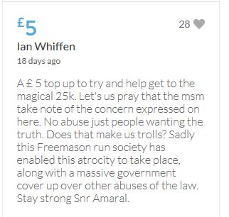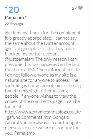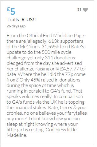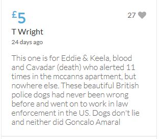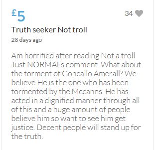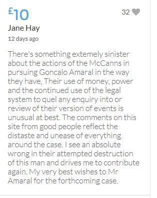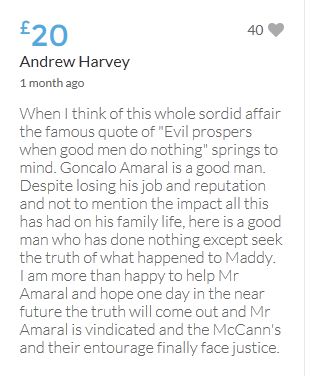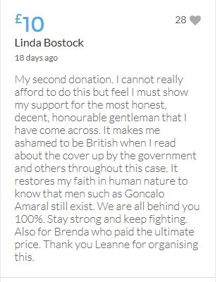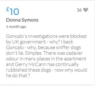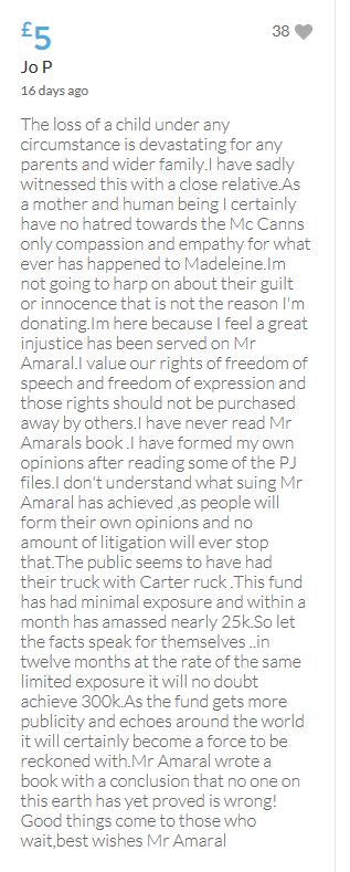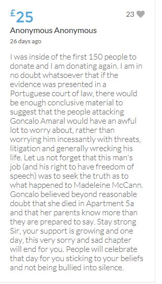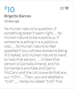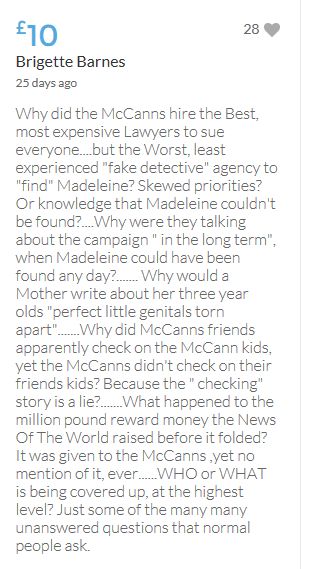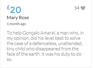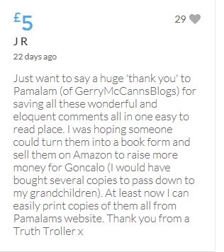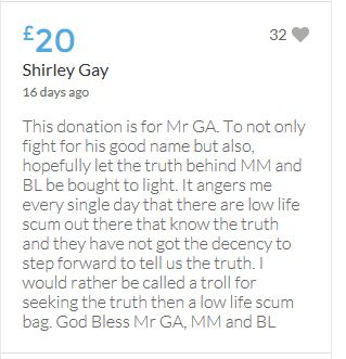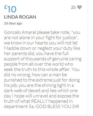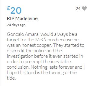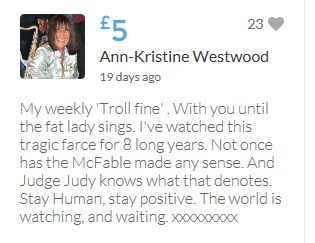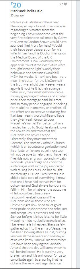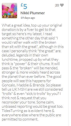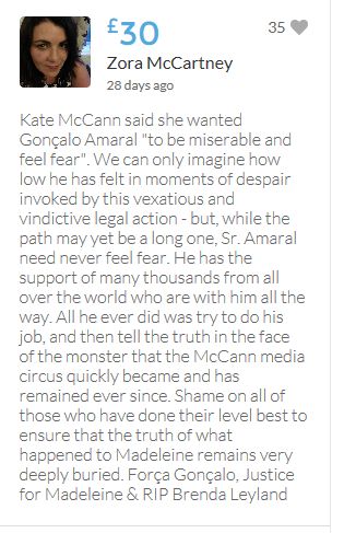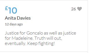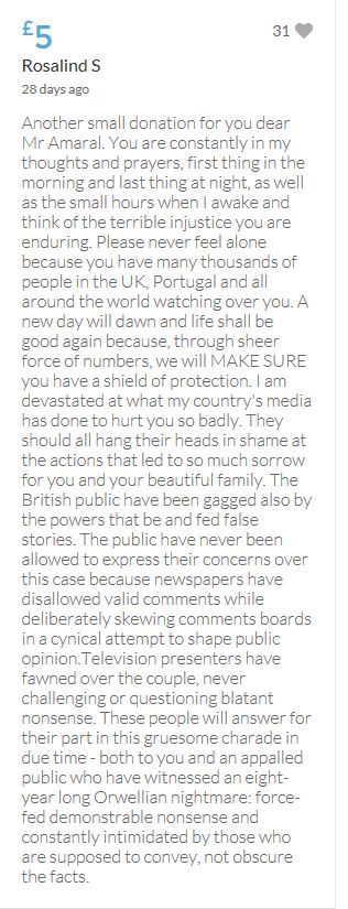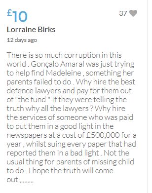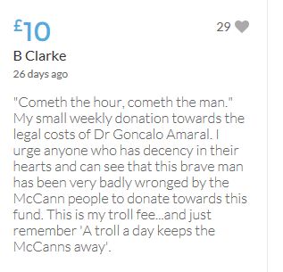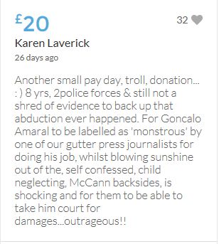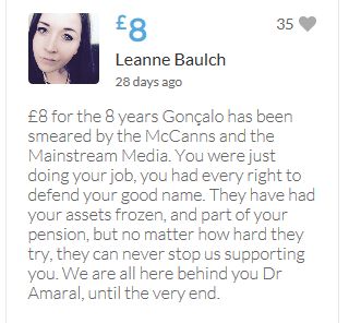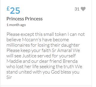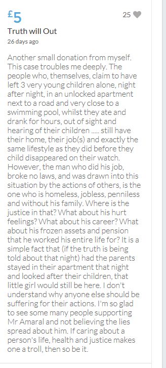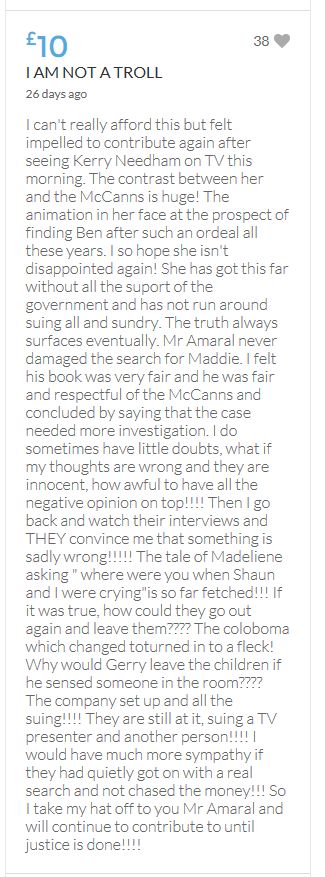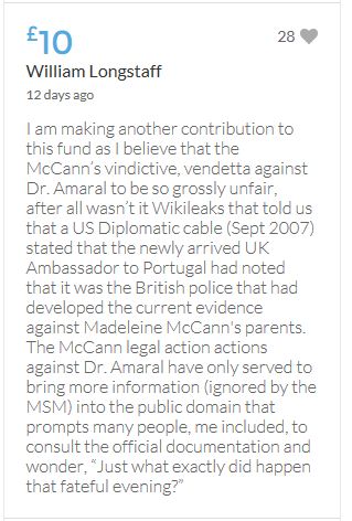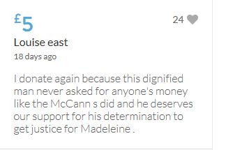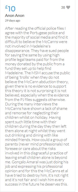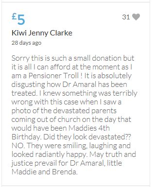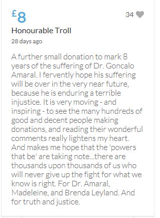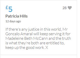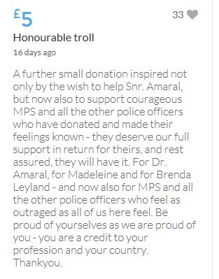 This is my second donation which I will continue to make weekly... I can't wait for the truth to come out and for those who label us trolls and haters to try and justify why they ignored and covered up the facts for so long. All we want is the truth for a small child who deserved love and protection, justice for a man who simply did his job and vindication for a brave lady who, like us, fought for the truth. For Madeleine, GA and Brenda!