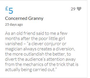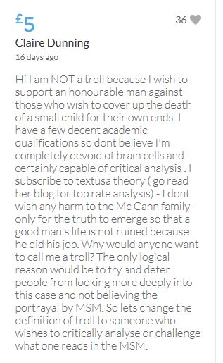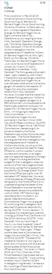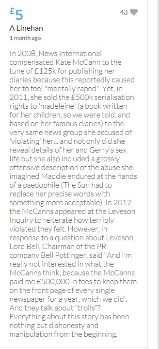 In 2008, News International compensated Kate McCann to the tune of £125k for publishing her diaries because this reportedly caused her to feel "mentally raped". Yet, in 2011, she sold the £500k serialisation rights to 'madeleine' (a book written for her children, so we were told, and based on her famous diaries) to the very same news group she accused of 'violating' her... and not only did she reveal details of her and Gerry's sex life but she also included a grossly offensive description of the abuse she imagined Maddie endured at the hands of a paedophile (The Sun had to replace her precise words with something more acceptable). In 2012 the McCanns appeared at the Leveson Inquiry to reiterate how terribly violated they felt. However, in response to a question about Leveson, Lord Bell, Chairman of the PR company Bell Pottinger, said "And I'm really not interested in what the McCanns think, because the McCanns paid me £500,000 in fees to keep them on the front page of every single newspaper for a year, which we did'. And they talk about "trolls"? Everything about this story has been nothing but dishonesty and manipulation from the beginning.