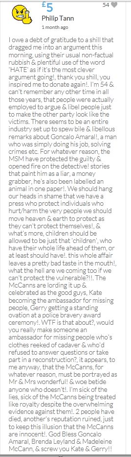 I owe a debt of gratitude to a shill that dragged me into an argument this morning, using their usual non-factual rubbish & plentiful use of the word 'HATE' as if it's the most clever argument going!, thank you shill, you inspired me to donate again!. I'm 54 & can't remember any other time in all those years, that people were actually employed to argue & libel people just to make the other party look like the victims. There seems to be an entire industry set up to spew bile & libellous remarks about Goncalo Amaral!, a man who was simply doing his job, solving crimes etc. For whatever reason, the MSM have protected the guilty & opened fire on the detective! stories that paint him as a liar, a money grabber, he's also been labelled an animal in one paper!. We should hang our heads in shame that we have a press who protect individuals who hurt/harm the very people we should move heaven & earth to protect as they can't protect themselves!, & what's more, children should be allowed to be just that 'children', who have their whole life ahead of them, or at least should have!. this whole affair leaves a pretty bad taste in the mouth!, what the hell are we coming too if we can't protect the vulnerable?!!. The McCanns are lording it up & celebrated as the good guys, Kate becoming the ambassador for missing people, Gerry getting a standing ovation at a police bravery award ceremony!. WTF is that about?, would you really make someone an ambassador for missing people who's clothes reeked of cadaver & who'd refused to answer questions or take part in a reconstruction?, it appears, to me anyway, that the McCanns, for whatever reason, must be portrayed as Mr & Mrs wonderful! & woe betide anyone who doesn't!. I'm sick of the lies, sick of the McCanns being treated like royalty despite the overwhelming evidence against them!. 2 people have died, another's reputation ruined, just to keep this illusion that the McCanns are innocent!. God Bless Goncalo Amaral, Brenda Leyland & Madeleine McCann, & screw you Kate & Gerry!!