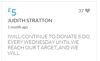 IWILL CONTINUE TO DONATE 5.OO EVERY WEDNESDAY UNTIL WE REACH OUR T ARGET,,AND WE WILL.