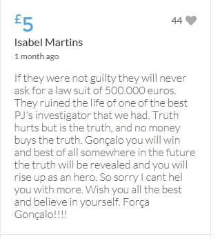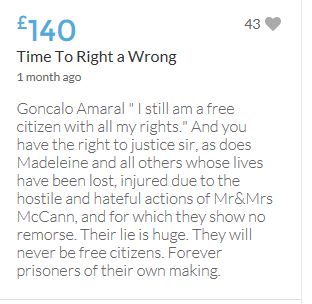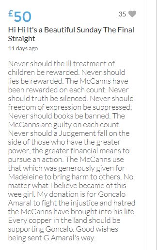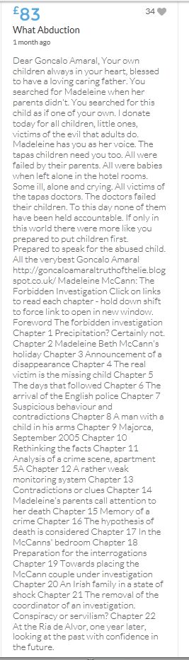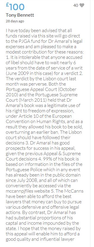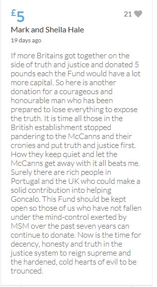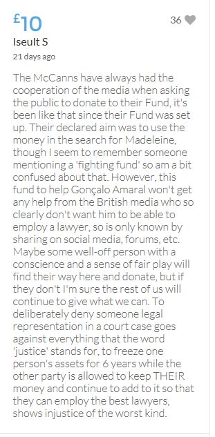 Never should the ill treatment of children be rewarded. Never should lies be rewarded. The McCanns have been rewarded on each count. Never should truth be silenced. Never should freedom of expression be suppressed. Never should books be banned. The McCanns are guilty on each count. Never should a Judgement fall on the side of those who have the greater power, the greater financial means to pursue an action. The McCanns use that which was generously given for Madeleine to bring harm to others. No matter what I believe became of this wee girl. My donation is for Goncalo Amaral to fight the injustice and hatred the McCanns have brought into his life. Every copper in the land should be supporting Goncalo. Good wishes being sent G.Amaral's way.