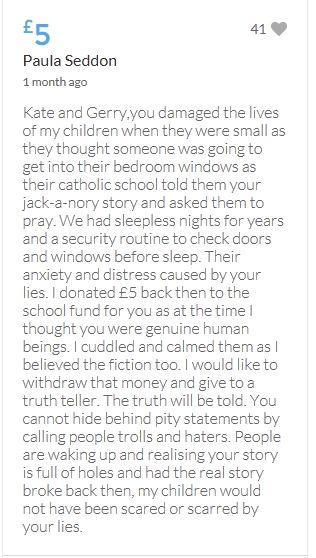 Kate and Gerry,you damaged the lives of my children when they were small as they thought someone was going to get into their bedroom windows as their catholic school told them your jack-a-nory story and asked them to pray. We had sleepless nights for years and a security routine to check doors and windows before sleep. Their anxiety and distress caused by your lies. I donated £5 back then to the school fund for you as at the time I thought you were genuine human beings. I cuddled and calmed them as I believed the fiction too. I would like to withdraw that money and give to a truth teller. The truth will be told. You cannot hide behind pity statements by calling people trolls and haters. People are waking up and realising your story is full of holes and had the real story broke back then, my children would not have been scared or scarred by your lies.