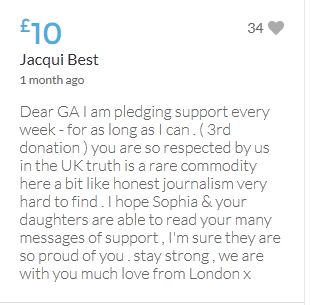 Dear GA I am pledging support every week - for as long as I can . ( 3rd donation ) you are so respected by us in the UK truth is a rare commodity here a bit like honest journalism very hard to find . I hope Sophia & your daughters are able to read your many messages of support , I'm sure they are so proud of you . stay strong , we are with you much love from London x