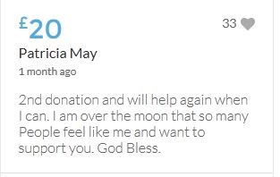 2nd donation and will help again when I can. I am over the moon that so many People feel like me and want to support you. God Bless.