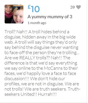 Troll? Nah!! A troll hides behind a disguise, hidden away in the big wide web. A troll will say things they'd only say behind the disguise never wanting to face-off the person they're trolling... Are we REALLY trolls?? Nah!! The difference is that we'd say everything we say online to the McCanns to their faces, we'd happily love a face to face discussion!!! We don't hide our profiles, we are not in disguise. We are not trolls! We are truth seekers. Truth-seekers United!! Hurrah!!!