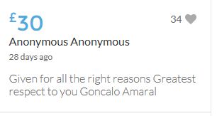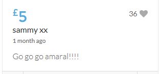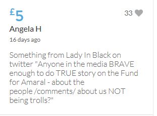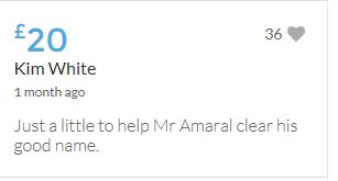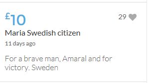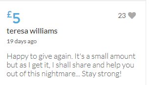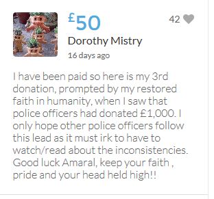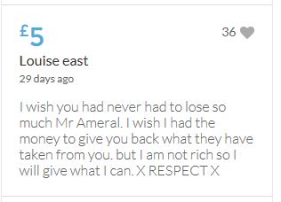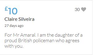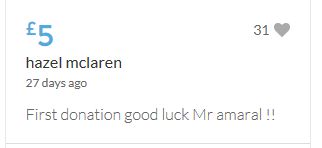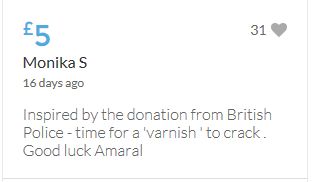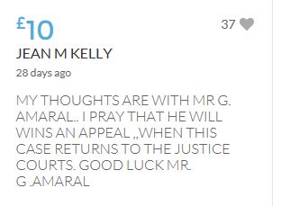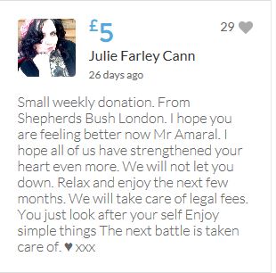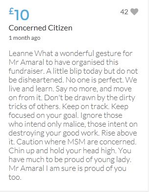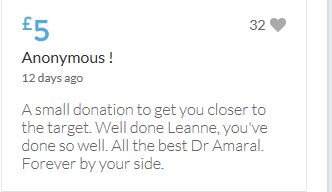I am donating because..well because i can! ( not even the Mcc's can stop me ) And also because i feel the need to stand shoulder to shoulder with Leeanne, Leeanne you are a true HERO. Mr Ameral and his family and colleagues will be so proud of you, can you imagine what this support will mean to them. You stood where none of us would stand you will wonder where none of us will venture, stay strong don't let anyone grind you down. Xx