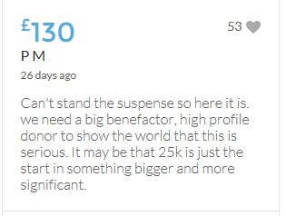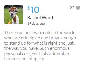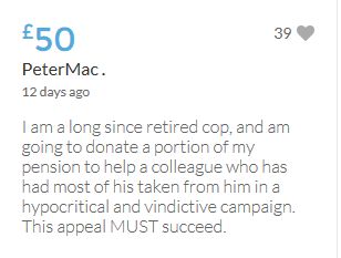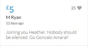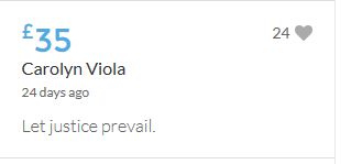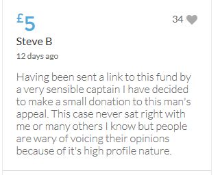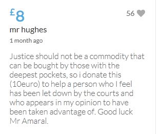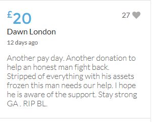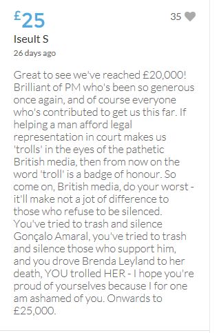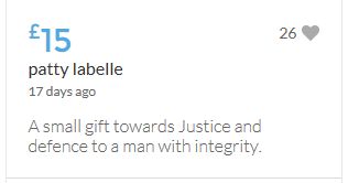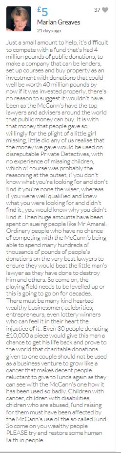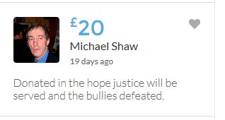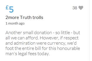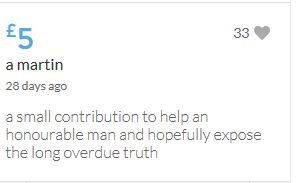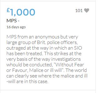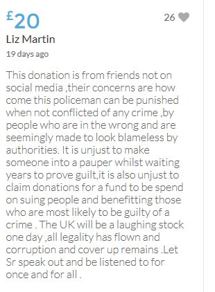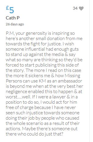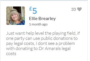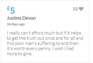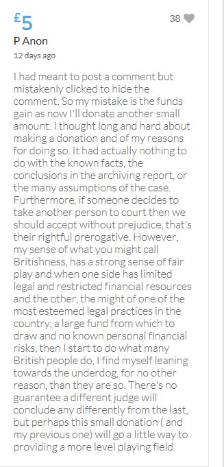 I had meant to post a comment but mistakenly clicked to hide the comment. So my mistake is the funds gain as now I'll donate another small amount. I thought long and hard about making a donation and of my reasons for doing so. It had actually nothing to do with the known facts, the conclusions in the archiving report, or the many assumptions of the case. Furthermore, if someone decides to take another person to court then we should accept without prejudice, that's their rightful prerogative. However, my sense of what you might call Britishness, has a strong sense of fair play and when one side has limited legal and restricted financial resources and the other, the might of one of the most esteemed legal practices in the country, a large fund from which to draw and no known personal financial risks, then I start to do what many British people do, I find myself leaning towards the underdog, for no other reason, than they are so. There's no guarantee a different judge will conclude any differently from the last, but perhaps this small donation ( and my previous one) will go a little way to providing a more level playing field