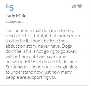Just another small donation to help reach the first total, if that makes me a troll so be it. I don't believe the abduction story, never have. Dogs don't lie. This is not going to go away, I will be here until we have some answers.. RIP Brenda and Madeleine. Snr Amaral, I hope you are beginning to understand now just how many people are supporting you