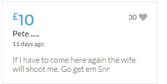 If I have to come here again the wife will shoot me. Go get em Snr